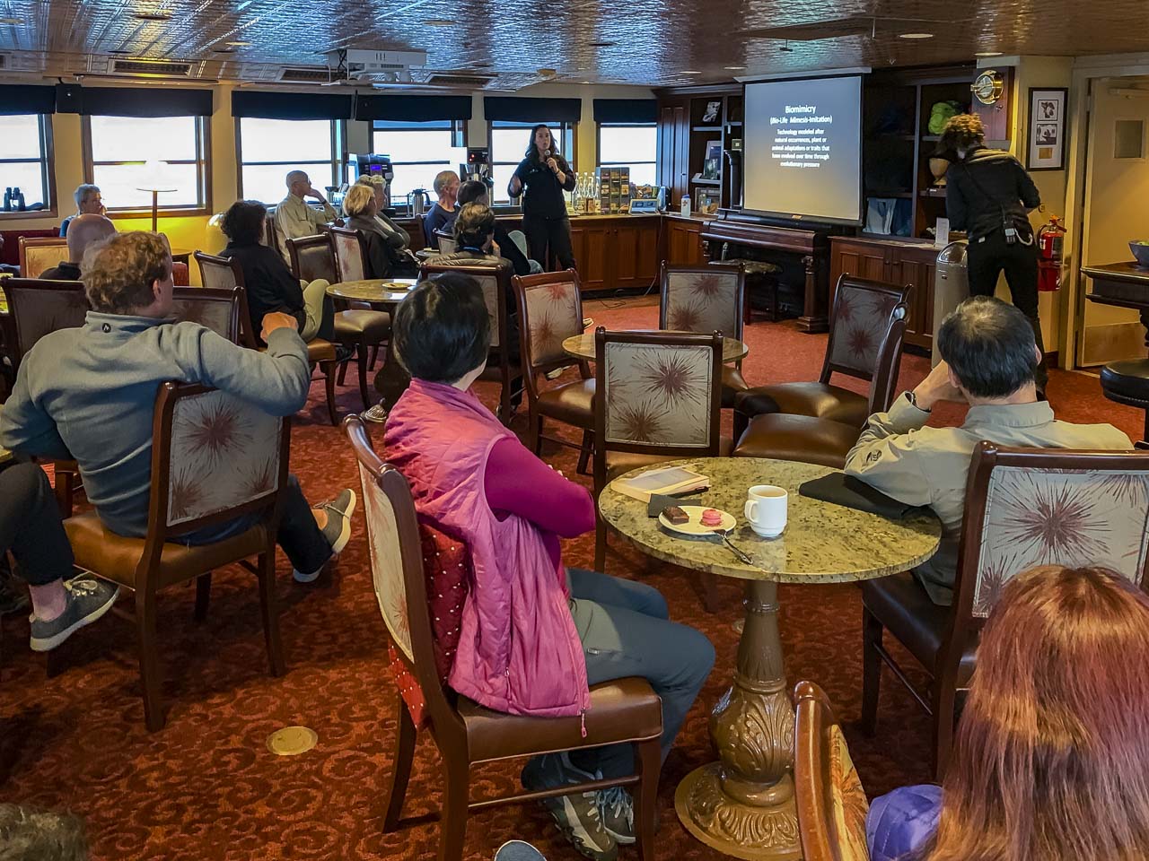 夕食後、毎晩、ガイドの1人がマイクを連れてゲストと専門知識を共有します。私たちはカクテルをつかんで、彼らがアラスカの動植物について話すのを聞くことができます。