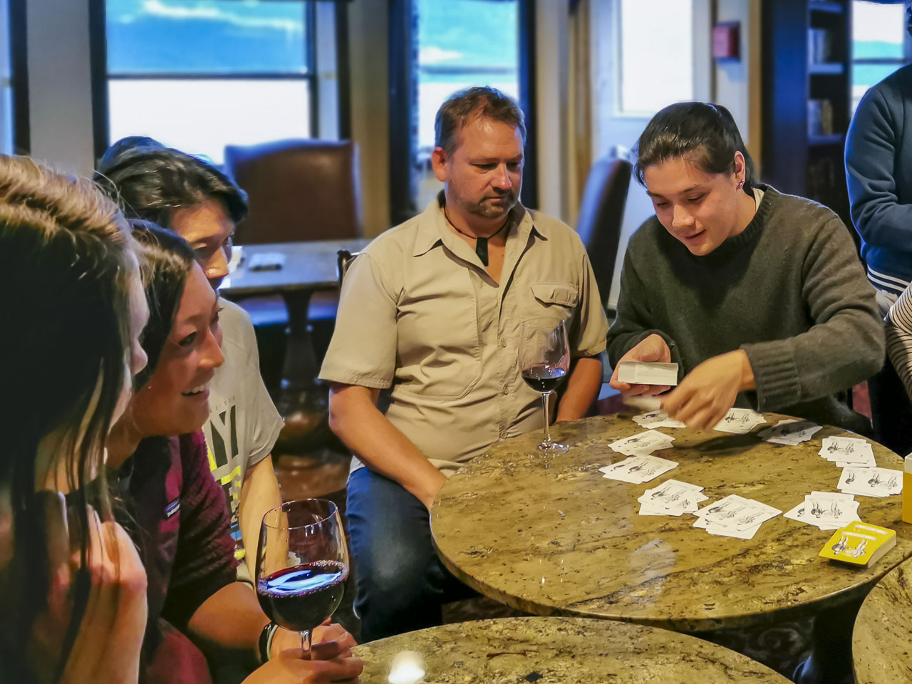 私たちが今まで出会った中で最もよく旅行された興味深い家族とゲームをする!Uncruiseは、選択したように冒険的またはリラックスできます。ラウンジでリラックスして本を読んだり、ボードゲームをプレイしたりするために、朝や午後を休む人がたくさんいました。これは究極の休暇であり、クルーズ船というよりも浮かぶコテージのように感じられます。クルーズでは、私たちは家にいると感じました。