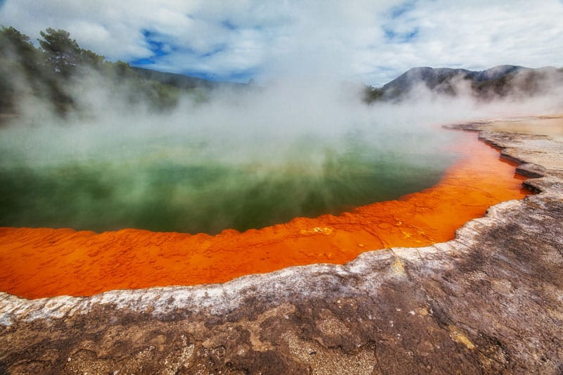 ニュージーランドのロトルアのサーマルプールの端に立っています。参照:ニュージーランドでやるべき15の最もユニークなこと。