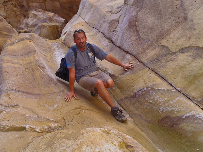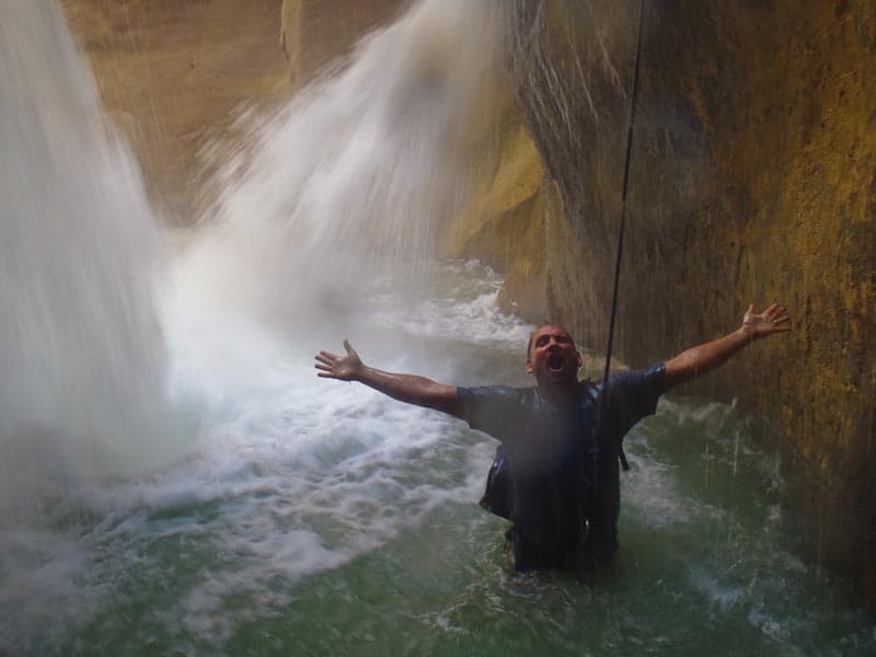 デイブはヨルダンでキャニオンに行きようとしています私たちの旅行仲間は非常に経験豊富な峡谷であり、ヨルダンで過去10日間の峡谷を過ごしたことが判明しました。彼らは峡谷を通り抜けて滝に向かって歩いていました。これは彼らのヨルダン旅行の終わり近くで、彼らはワディ・ムジブを介してガイド付き旅行をすることにしました。