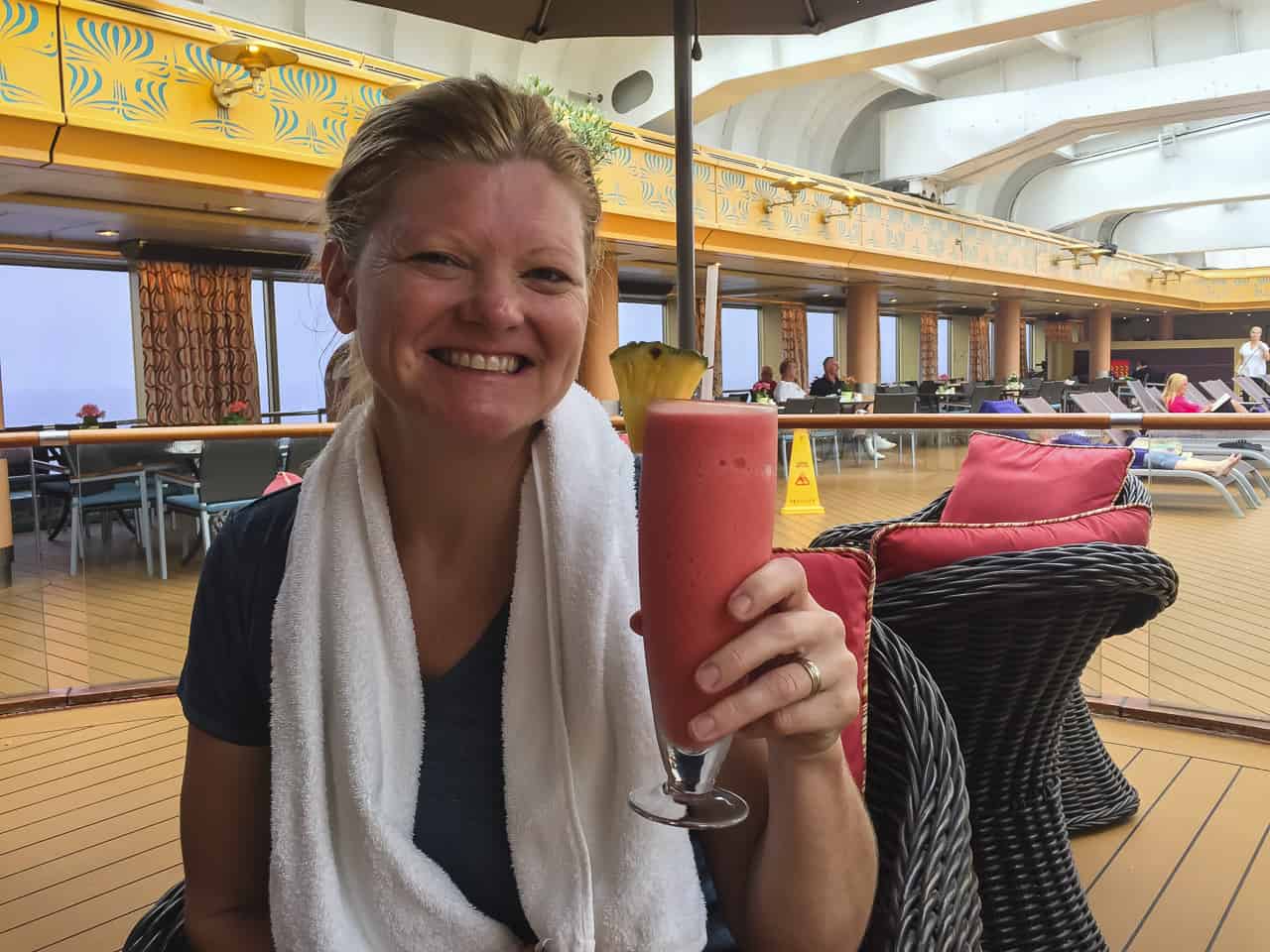 ワークアウト後にスムージーを楽しんでいます巨大な朝食ビュッフェに行く代わりに、私たちはプールのそばの新鮮なフルーツスムージーを選びました。クルーズのスタッフは傑出しており、初日後に私たちの名前を暗記したと言ったとき、私は誇張していません。何か注文した瞬間、彼らは翌日行く準備ができていました。