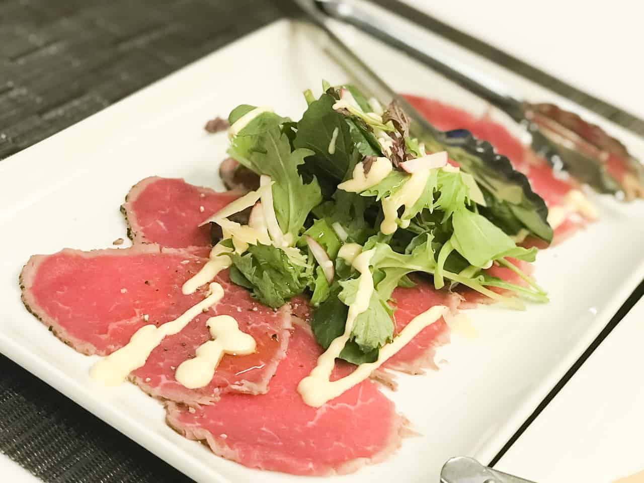 牛肉のカルパッチョとパルマハムのサンプラーが、私たちの口で溶けた味を味わうために私たちのために持ってきました。
