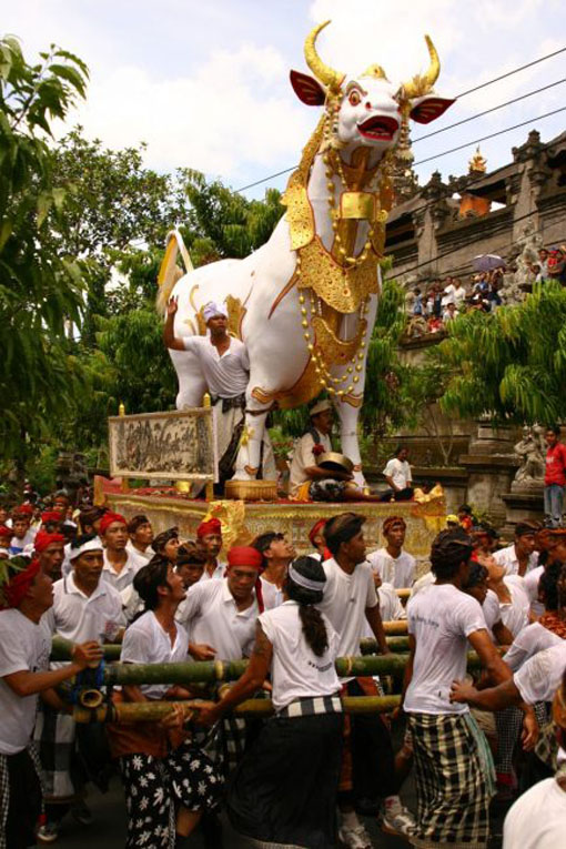 それは、何十人ものサロンの覆われた男性によって運ばれた巨大な白い神聖な牛に導かれました。