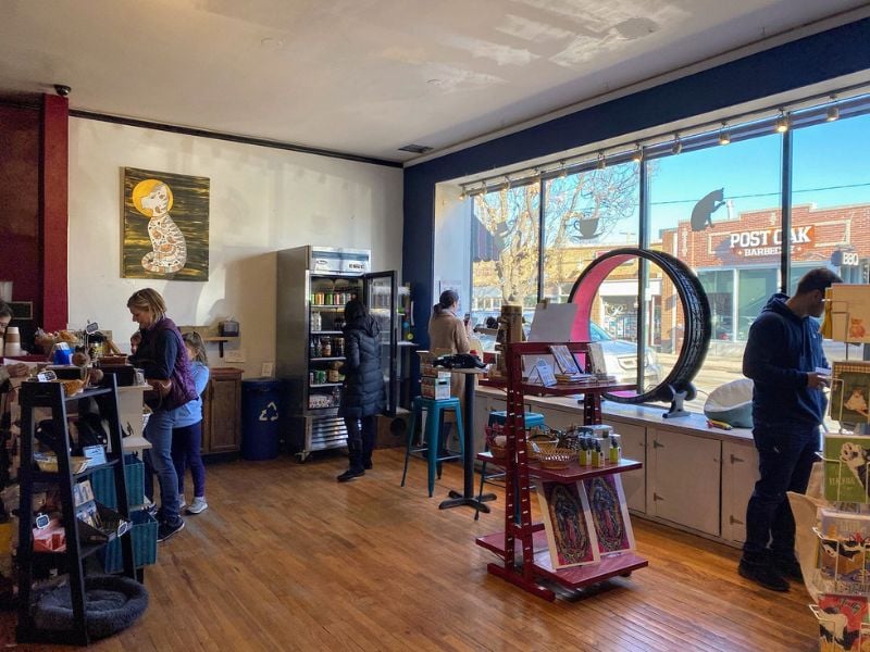 スペースは、ビジネスというよりも誰かのリビングルームのように感じられます。本、猫のおもちゃ、地元の芸術はどこにでもあります。彼らの飲み物は、猫をテーマにしたフォームアートをトッピングしたチャイや季節のラテのように、しっかりしています。たむろしてネコの会社を楽しむための寒くて圧倒的な場所です。