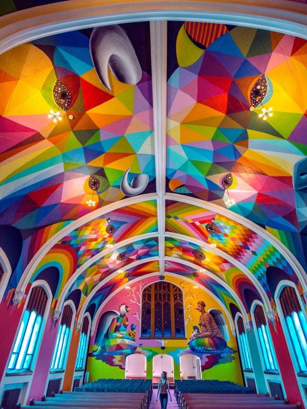 国際大麻教会デンバーの最も心を曲げる魅力かもしれません。 1世紀前の教会に収容されており、スペインの芸術家オクーダ・サン・ミゲルによる大規模な壁画のおかげで、内部は色で爆発します。明るい幾何学的パターンは壁と天井を覆い、スペースを視覚的な旅行に変えます。