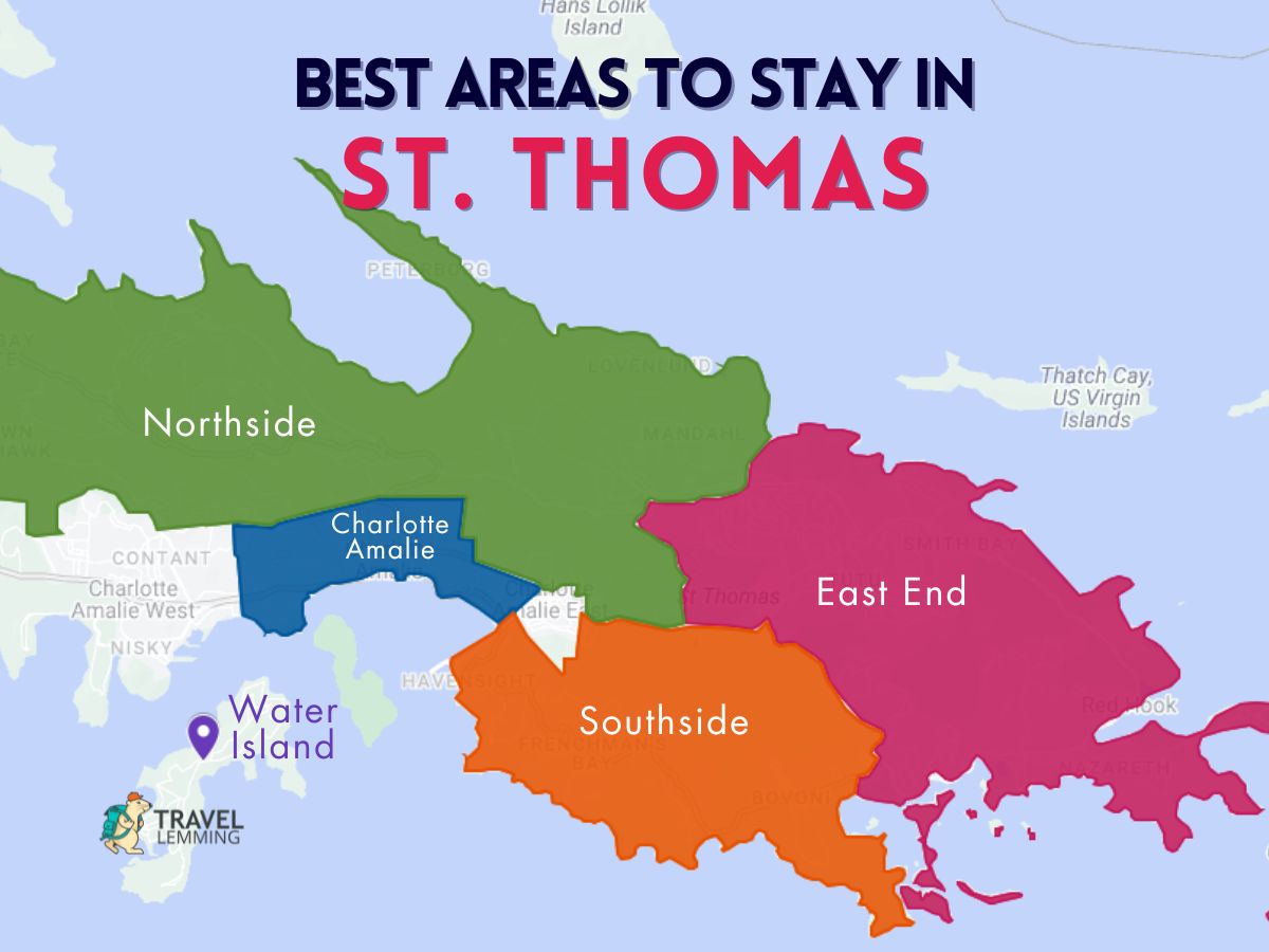 セント トーマスは 7 つの異なる地区に分かれており、そのうちイースト エンド、サウスサイド、シャーロット アマリー、ノースサイド、ウォーター アイランドの 5 つが旅行者を受け入れるのに適しています。
